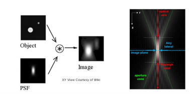 PSF, as the name suggests, is the response of an imaging system to a point source. This function describes the ‘spread’ due to the nature of the optical system. The final image is the convolution of the object with the PSF [Fig 1].
