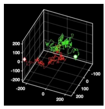 Conventional 2D tracking requires axial stitching to extend the imaging volume and not lose particles to defocus. Utilising the SPINDLE® and SPINDLE² in conjunction with Double Helix Optics’ 3DTRAX software, as the particle moves in the axial position the data is recorded in the angle that the lobes make. So now we can track these particles in 3D with remarkably high precision, enabling a much better reconstruction of the particle’s overall trajectory [Fig 10].