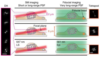 To do this they matched the thickness of the light sheet with the depth of focus of the Double Helix PSF. They then used a long-range Tetrapod PSF to track fiducials on the coverslip of the imaging chamber. By tracking the fiducials while imaging separate slices of the sample with the Double Helix PSF they were able to image and reconstruct structures throughout whole mammalian cells.