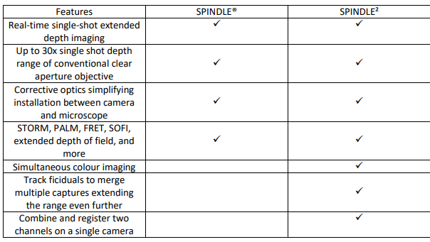 Designed as modular upgrades compatible with most scientific microscopes, the SPINDLE product family seamlessly extend the capabilities to enable 3D superresolution and extended depth of field imaging and tracking.