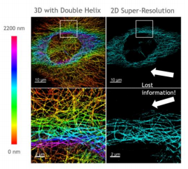 Adding the Double Helix Optics’ SPINDLE® enables the recovery of up to 10x more depth information than in a 2D SMLM experiment.