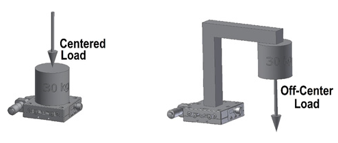 The presentation of most translation stage products includes a set of performance specifications like travel range, load capacity, and travel accuracy. However, it is surprising that considering the high number of applications requiring off-center loading, only a few suppliers include this value in their specifications. This omission has led many users to incorrectly assume that the standard load capacity of a stage applies to all types of loading configurations.