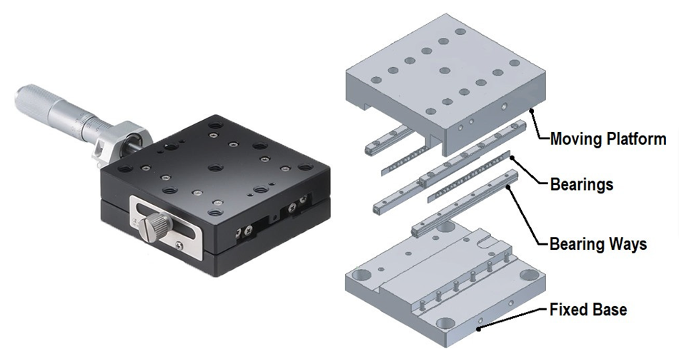 The main elements of a translation stage are fairly simple, consisting of a fixed base, a moving platform along with bearing ways, and bearing (Figure 2). When a translation stage carries a centered static load, the force of the load travels evenly from the top platform through the bearings to the base. If the load exceeds the capacity of the stage, failure can occur. The failure mode varies but is normally characterized by a localized plastic deformation of the bearing ways which causes the stage to lose its travel accuracy and parallelism.