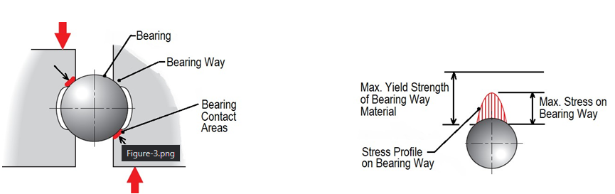 This denting results from stress levels at the contact area between the bearing and bearing way that exceed the yield strength of the bearing way material (Figure 3). Regardless of how a stage is loaded, whether normally or eccentrically, the most common failure mode is bearing way denting.