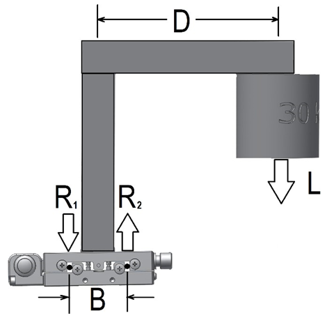 In the absence of an off-center load specification, an approximation can be made using the stage’s standard normal load capacity specification. Additional data is also needed: the actual payload weight, the distance the payload is from the center of the translation stage, and the spacing between the bearing ways. The basis of the approximation is a simple statics calculation of compound loading. A free body diagram, Figure 4, shows that the off-center (cantilevered) load, L, is supported by the two rows of bearings on the stage, R1 and R2.