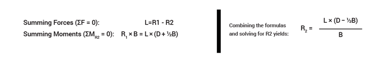 It is important to note that the force equation shows that the load on the two bearing ways is not evenly distributed; in fact, the R2 bearing way which is closest to the payload takes most of the load. Therefore, it is the R2 value that must be less than the per-bearing-race load rating (PBRL) of the stage to be able to adequately handle the load.