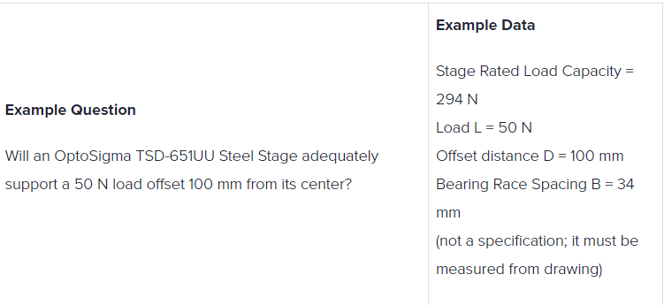 There is an easier and more accurate way to make this calculation. As noted earlier, in spite of the high number of applications employing off-center loading, only a few suppliers include it in their specifications. OptoSigma is one of the suppliers that does. Using the OptoSigma stage from the previous example, TSD-651UU, we can find a published specification called Maximum Moment Capacity (MMC). The value is 14.7 N·m for the configuration we are using (roll).