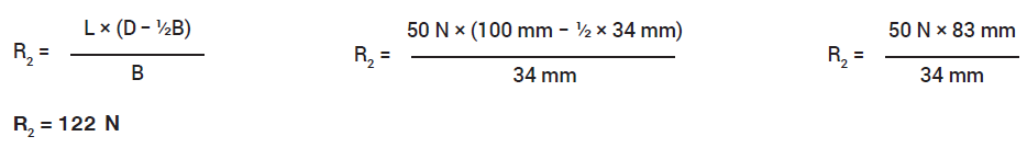 Finally, we compare the rated load per bearing race (PBRL) with the R1 and R2 forces. If both R1 and R2 are less than the per-bearing-race load rating, the stage will support the applied load. R1 and R2 are calculated from the free body diagram shown in Figure 4.