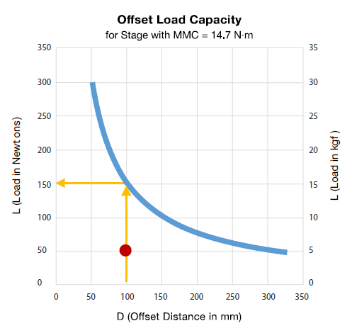 The actual curve on the graph represents the limit of the stage’s off-center load capacity. Using the graph to solve our example problem, we locate the offset distance (100 mm) on the x-axis and find where this intersects the curve. From this we see that the maximum load would be ~150 N (or 15 kgf). Since the load in the example is 50 N (indicated by red dot on graph), we have the same conclusion as before; the stage will work. Basically, any combination of “offset distance” and “load” that yields a coordinate on the graph that is on or below the curve would be within the capacity of the stage.