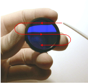 3) Inspect filter. Use a room light or any bright light source to inspect the optic to ensure that it is clean. Tip, tilt, and rotate the optic while viewing it as close to your eye as you can focus. If contamination remains, start with a brand new wipe or swab and repeat step 2 above. For every new cleaning attempt, ALWAYS use a new wipe!