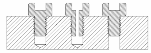 A virtual leak is a small pocket of trapped gas in a device that is linked to the larger vacuum chamber through a small channel. This causes a slow outgassing process that can prevent the vacuum chamber from reaching the desired pressure. An example of a virtual leak is a threaded hole with a fastener that is not vented. Figure 8 shows the difference between a blind hole, a vented screw, and a through hole.