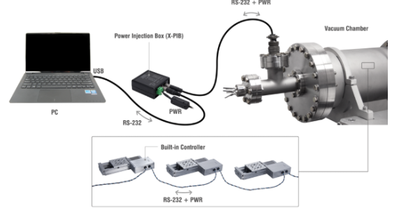 Because we have optimised our built-in controllers to withstand low and high vacuum pressure, they can be daisy-chained in a vacuum chamber. This means that multiple devices can share one power supply and a single connection to a computer, which reduces the number of wires to your feedthrough.