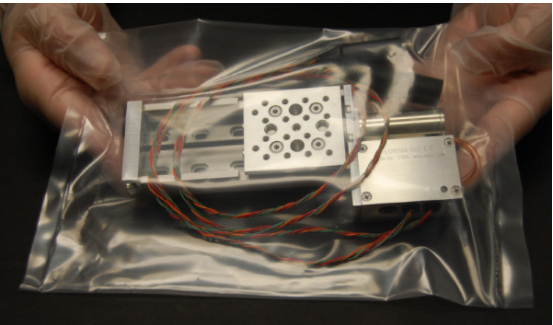All components for Zaber’s high vacuum devices are ultrasonically cleaned prior to assembly. In addition to ultrasonically cleaning the components, the devices are assembled in a class 100 (ISO class 5) cleanroom. The parts do not leave the cleanroom until the finished products are packaged and ready to ship. When Zaber’s high vacuum devices are ready to ship, they are packaged in Ultra Low Outgassing (ULO®) polyethylene bags inside their cleanroom and double bagged, allowing the end user to remove the outer bag prior to inserting the device into their cleanroom. Figure 11 shows an example of a high vacuum device double bagged in ULO®.