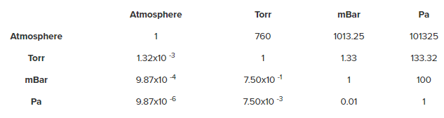 There are several standardised units used to specify pressure, including torr, milliBar (mBar), and pascals (Pa). Defining a vacuum pressure in terms of standard atmospheric pressure is also common. The relationship between these common units are found in Table 1.