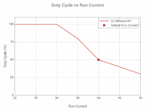 In addition, Zaber have optimised their PCBs and firmware to ensure that their devices maintain a temperature that produces reliable performance and optimal overall lifetime. This includes modifications to the PCB housing to increase heat sinking and modified firmware to control heat generation. When selecting a vacuum compatible Zaber device for your application, it is recommended that you contact our Zaber product manager to determine an appropriate duty cycle and running current combination. An example of a run current vs duty cycle plot can be found in Figure 6 below.