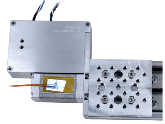 Zaber’s X-series vacuum devices have an integrated temperature sensor on their controllers; however, it is also recommended to add a sensor to the motor to monitor the temperature. For example, a K-type thermocouple or other temperature sensor may be mounted to the motor to monitor temperature in order to reduce the risk of overheating as seen in Figure 7 below.
