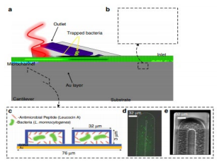 Accurate and high throughput detection is essential in the fight against drug resistant bacteria. A microcantilever with an embedded microfluidic channel can be used to selectively capture bacteria passing through the channel and using a QCL to excite the trapped bacteria provides a mechanical IR spectrum for selective identification.