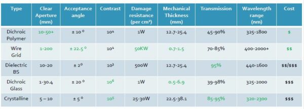 When choosing a polariser it is normally a balance of several key considerations: cost, wavelength range, aperture size, acceptance angle, damage threshold, transmission efficiency, and extinction ratio. A summary table can be seen below