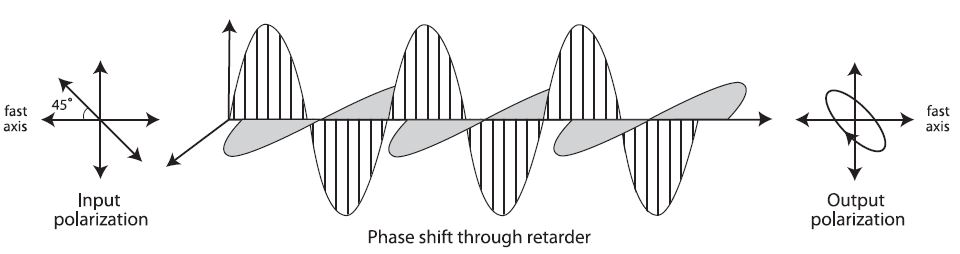orthogonal components vibrating along the fast and slow axes. Plane polarised light is oriented at 45° relative to the fast axis of the retarder. The orthogonal polarisation components travel through the material with different velocities (due to birefringence) and are phase shifted relative to each other producing a modified polarisation state. The transmitted light leaves the retarder elliptically polarised.