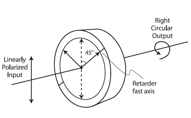 linearly polarised light is converted to righthand circular polarised light by the quarter-wave retarder. Upon exiting the quarter-wave retarder, light polarised parallel to the slow axis is retarded by 1/4 wave relative to light polarised along the fast axis. When recombined, the exit light is circularly polarised.