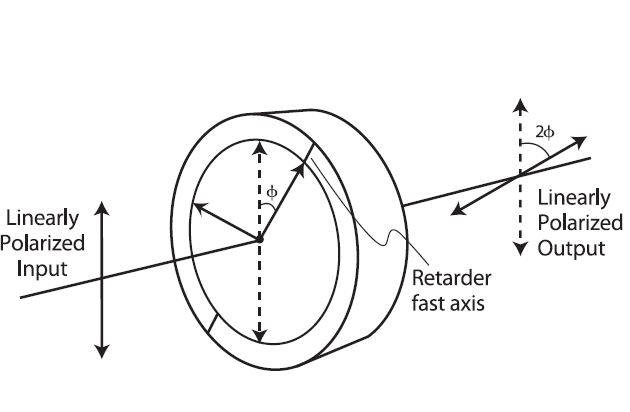 polarisation is 45°, horizontal polarised light is converted to vertical. A half-wave retarder rotates a linear polarised input by twice the angle between the retarder fast axis and the input plane of polarisation, as shown below: