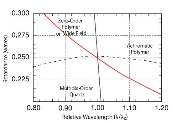 construction of achromatic retarders is the same as that for zero-order polymer retarders. A comparison of different retarder types and their dependence on wavelength is shown below