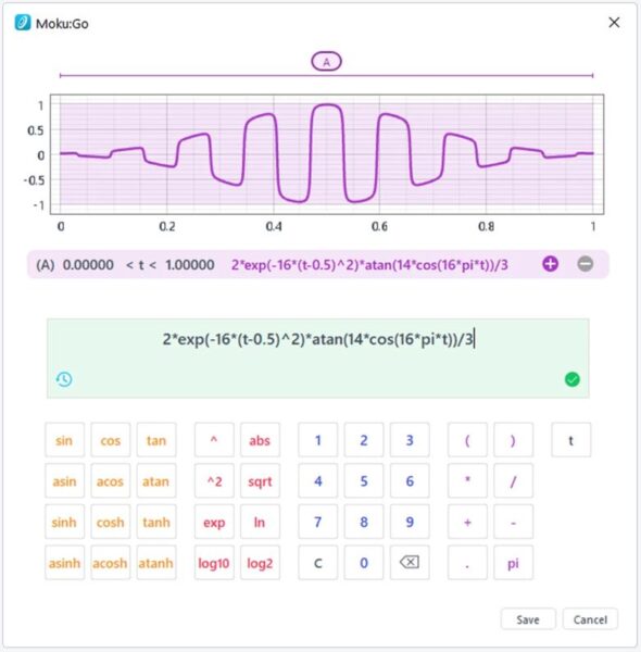 Edit complex equations live and apply them instantly to your experimental setup. Choose to define the waveform with up to 32 segments. For a fully contained stimulus and response system, combine the Moku Arbitrary Waveform Generator with Oscilloscope in Multi-instrument Mode.