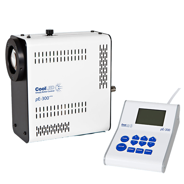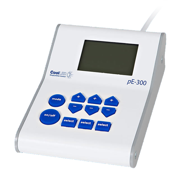The pE-300white is a compact light LED illumination unit. It provides a broad spectrum of illumination, covering the excitation bands of common fluorescent stains. Operation is by a remote manual control pod with instant on/off and intensity control from 0 – 100%. It allows adjustment of output in 1% steps, giving precise control. The broad spectrum covers everyday fluorophores: DAPI, cyan fluorescent protein (CFP), Aqua, fluorescein isothiocyanate (FITC), tetramethylrhodamine (TRITC), texas red, Cy5 and many more.