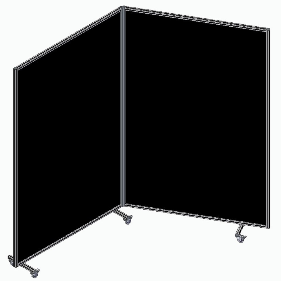 The standard plate material (M7P06) is based on an aluminum sandwich structure with coated aluminum cover plates (black). This has been tested and certified in accordance with DIN EN 60825-4. Optionally, all other laservision filling materials (e.g. plastic windows) can be installed. Due to the flexibility of the hinge, the laser protection folding wall system can be stored in a very space-saving manner. It is secured in the end position with a sturdy strap supplied.