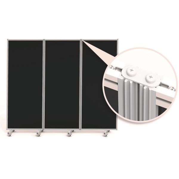 The special feature of the E25 folding wall system is the new, revolutionary hinge system in which, without an additional cover, a completely light and laser beam-proof flexible connection is achieved. No matter what angle (0 ° – 360 °) the wall is set up, there is protection against radiation. The application-specific configurable folding wall system consists of at least two start and end modules, and can be supplemented with the required number of E25 intermediate modules. The complete folding wall system can therefore consist of 2 to 9 modules. The basic system is equipped with two approx. 30cm long brackets with lockable rolls (industry standard). Each additional module has only one bracket with 2 lockable rollers. This enables an individual installation, as required.