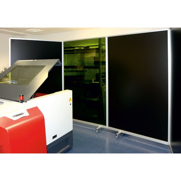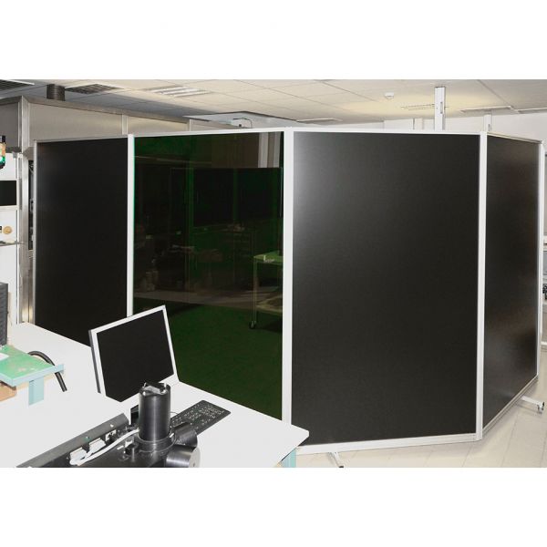 The E25 modular, fully assembled laser protective folding wall system from laservision offers a flexible and quick way to shield laser radiation during maintenance and service work on powerful lasers. The partition can e.g. can also be set up as a room divider in laboratories or laser-safe partitioning around optical tables.