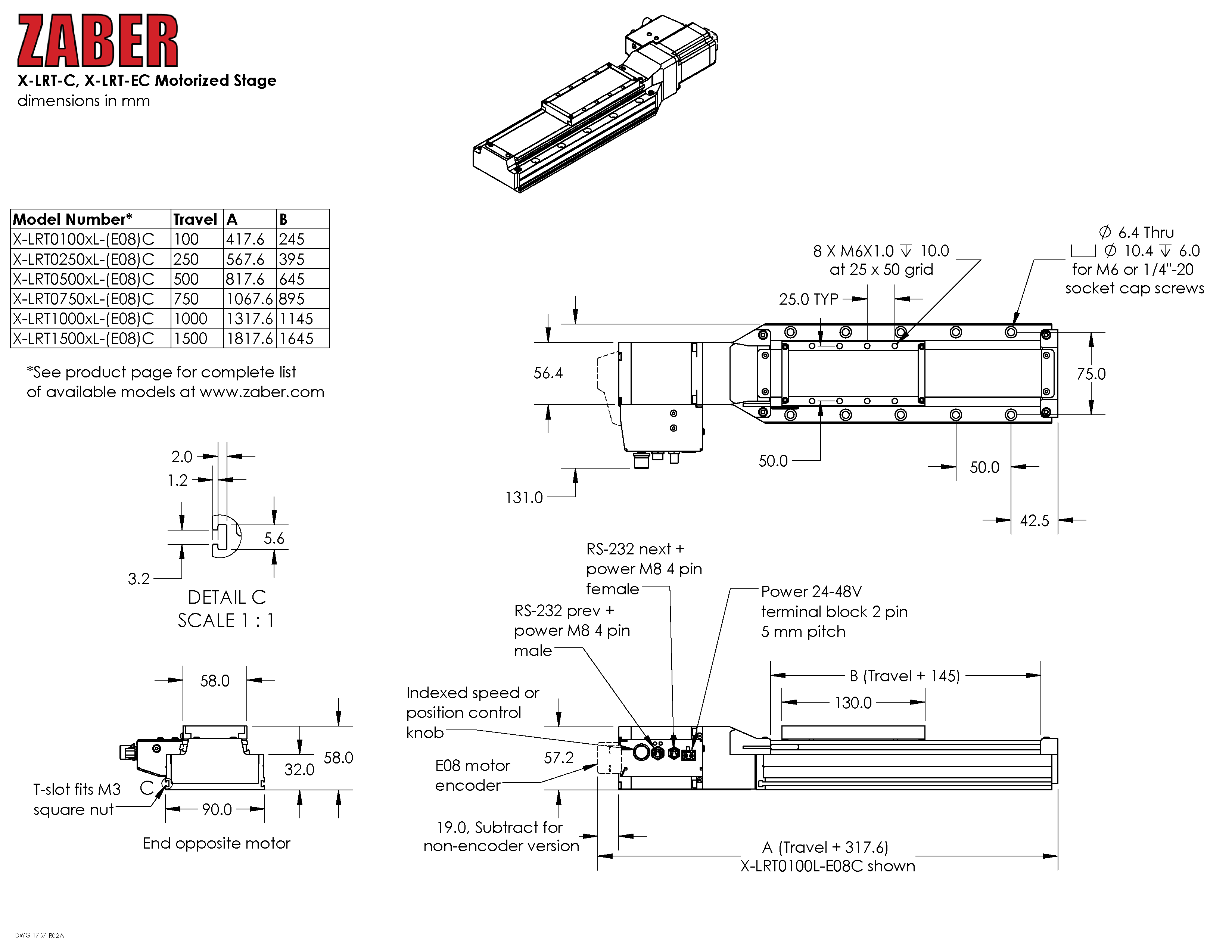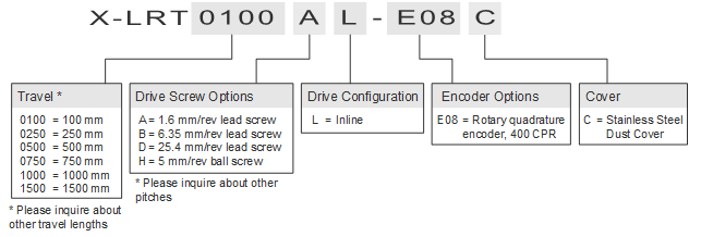 - 100, 250, 500, 750, 1000, 1500 mm travel