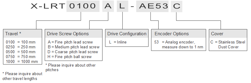 100 mm travel, 250 mm travel, 500 mm travel, 750 mm travel, 1000 mm travel