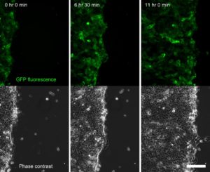 Time series of a confluent sheet of keratinocytes migrating during a live-cell imaging outgrowth assay, acquired on an Olympus IX-83 microscope equipped with a CoolLED pE-4000 lightsource. Scale bar = 150 μm.
