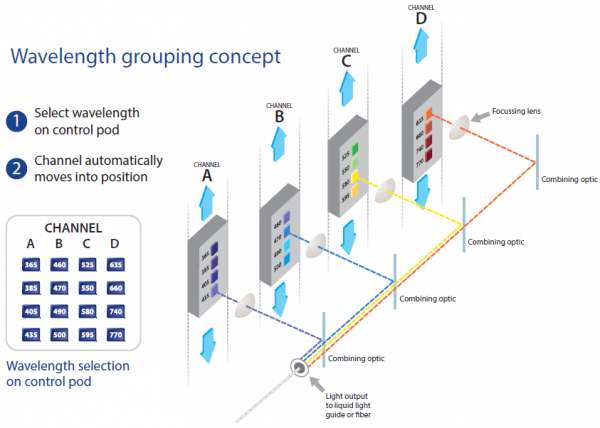 This comes from recognising that all the stains used in multi-band work can have their absorption bands divided into four separate groups across the spectrum due to the restricted bandwidth available. This has allowed the development of a patent-pending, wavelength-grouping concept which makes it possible to deliver more power in an efficient four channel system.