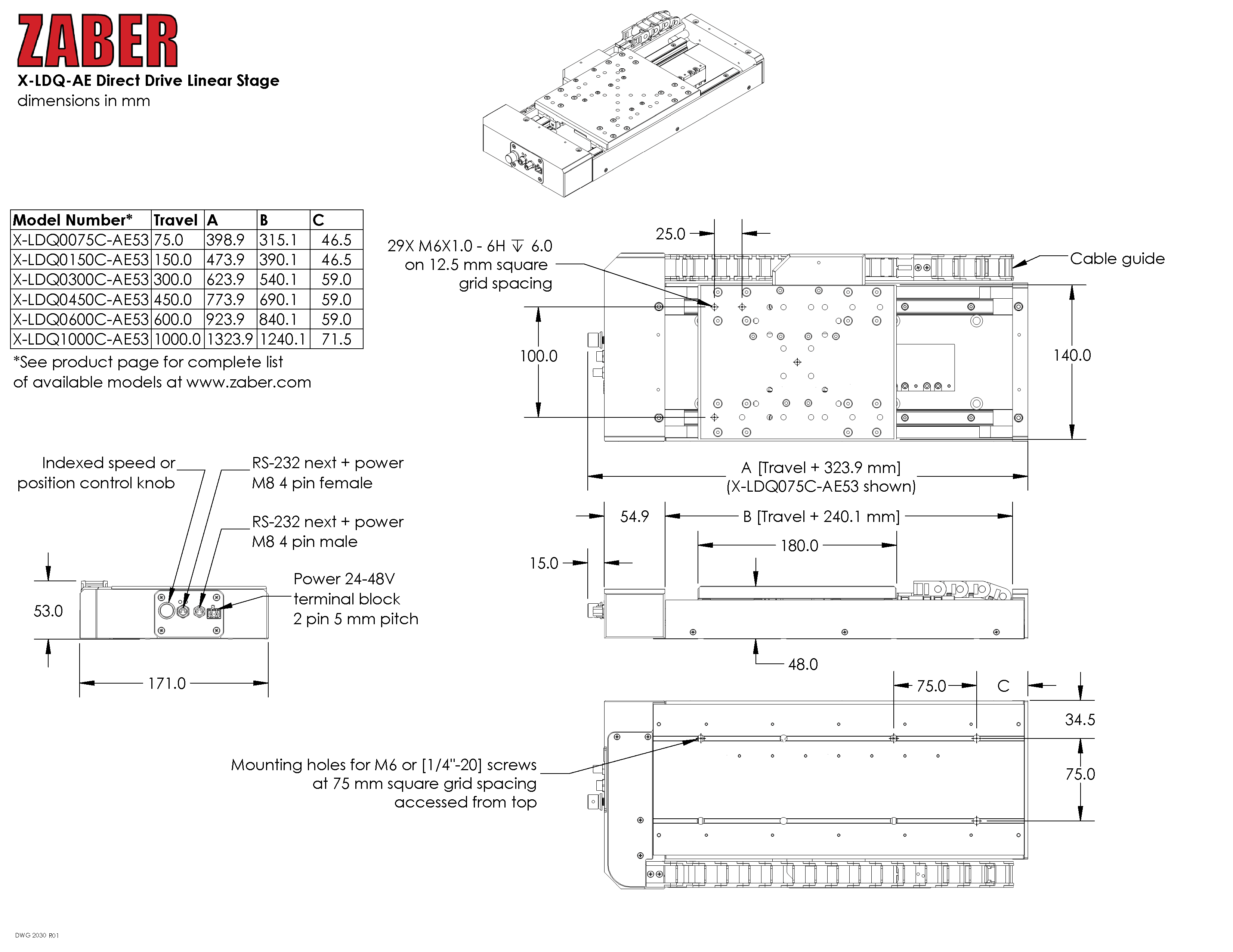Zaber Technologies’ X-LDQ-AE Series devices are computer-controlled, motorized linear motor stages with high precision and speed capabilities. They are stand-alone units requiring only a standard 48 V power supply. The built-in controller and linear encoder allows pre-tuned closed-loop servo positioning with adjustable tuning parameters. An optional indexed knob provides convenient manual control for versatile operation even without a computer. These stages connect to the RS-232 port or USB port of any computer, and they can be daisy-chained with any other Zaber Technologies products.