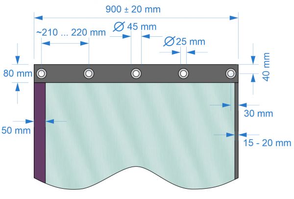 The multi-layer laser safety curtain BC1.F1P01 has a width of approx. 900mm or 1800mm and a length of 2000mm up to 3500mm. The single segments of this curtain can be connected together with Verlo strap. Mounting is realized by a set of eyelets on the top of the curtain element. The length (height) of the segments can flexible be customized. The curtain is certified acc. EN 12254 and EN 60825-4 (CE).