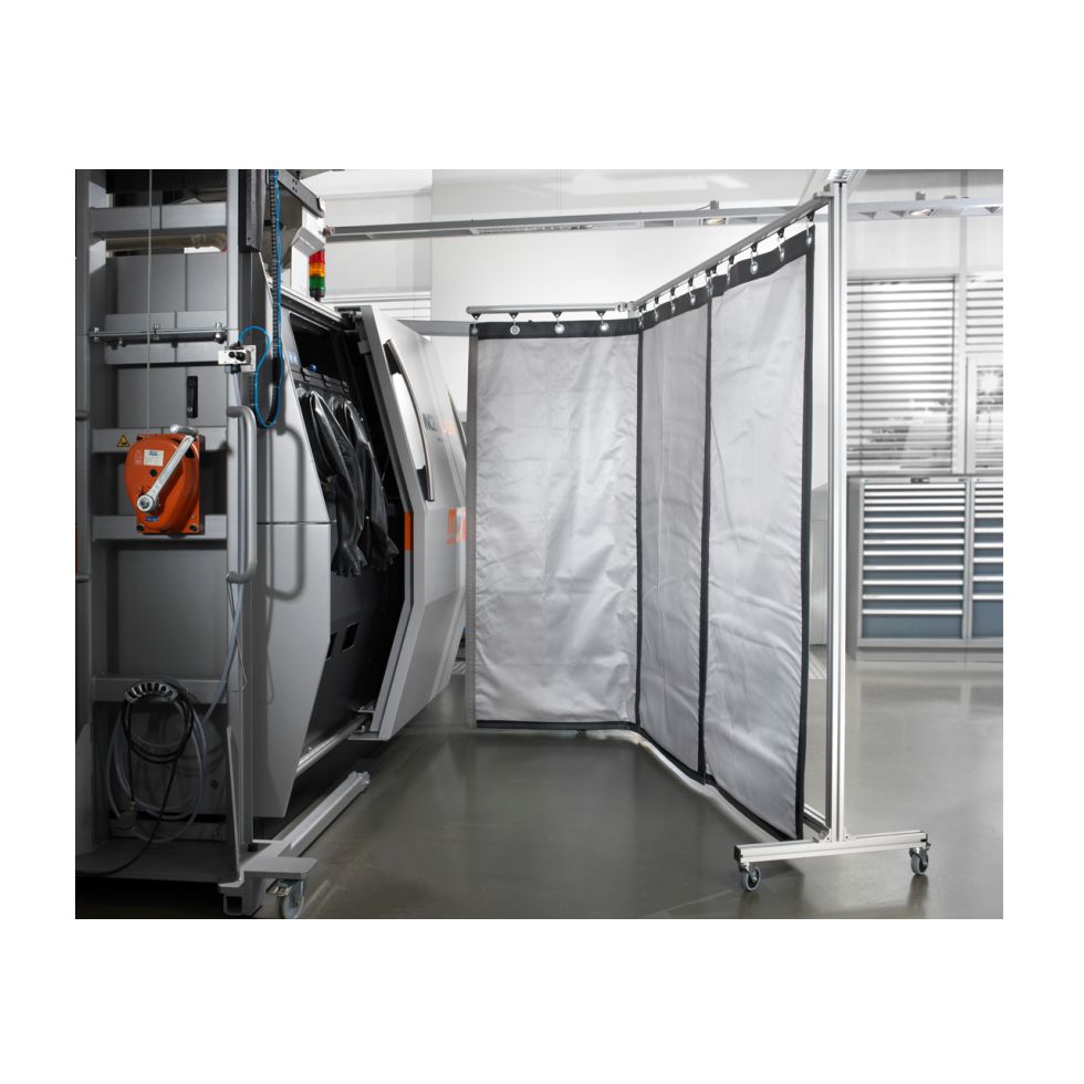 The multi-layer laser safety curtain is certified acc. EN 12254 and EN 60825-4 (CE). It features enormous flexibility within the arrangement regarding height and width. The standard segments height are 2m, 2,5m, 3m or 3,5, the standard width are 900mm or 1800mm, can be combined in different ways. The standard segments can be connected together Velcro straps. As an option it is also possible to fix the segments overlapped at the girder (frames and rail systems) and be brought in position as needed. This guarantees a subsequent adaption of the laser protection, independent of the segment width, regarding the eyelets on the top. Concurrently there is the possibility to change the laser safety areas to custom-designed, as it often requested within the research- and shop-floor level and to comply with the emergency exits.