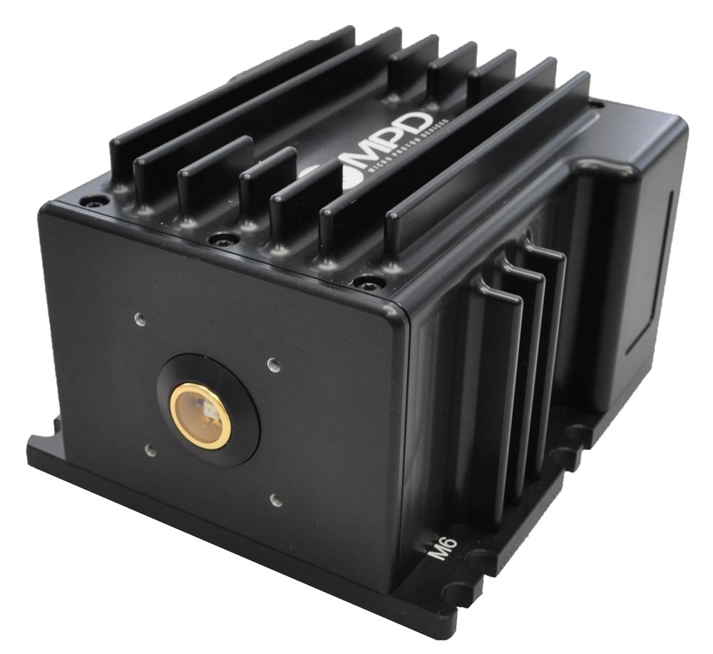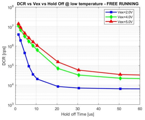 The PDM-IR is a photon counting module based on an InGaAs/InP Single-Photon Avalanche Diode (SPAD) for the detection of near-infrared single photons up to 1700 nm (see PDE graphs). The module includes a programmable frequency and pulse generator for gating the detector, a front-end circuit for photodetector’s avalanche sensing, a fast circuit for detector’s avalanche current quenching and operative bias voltage resetting and some sub-circuits for signal conditioning. All the main parameters and delay paths are adjustable by the user through the software interface, in order to match the requirements of different applications. The system can be conveniently used both for counting and timing measurements, since the high-performance electronics guarantees a clean temporal response even with fast gate transitions (see typical IRF curves displayed here below). PDM-IR can work either in free-running or in gated mode and the optical interface can be chosen between free space and a pigtailed version. Here below typical DCR vs Hold-Off are shown for both gated and free-running modes.