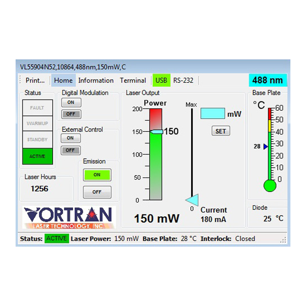 The Stradus family products can be operated as a fully CDRH compliant and independent system with the Control Box/ Power Supply or as a completely self-contained OEM head. Each laser is in a standard bench top format footprint, with a separate drive electronics controller unit. However, the laser can operate independently of the drive electronics unit. On board is a 32-bit ARM microprocessor that gives you unprecedented control of the laser module.