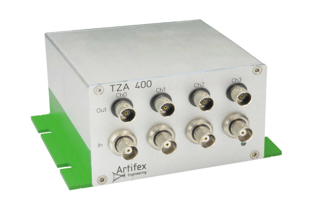 The TZA series is insensitive to electromagnetic interference by design, an important factor when working in ‘dirty’ industrial environments. The case wings allow you to mount the amplifier on standard 25mm and 1″ optical tabletops and are useful for OEM applications. Please see the datasheets for full details of the options available for each model.
