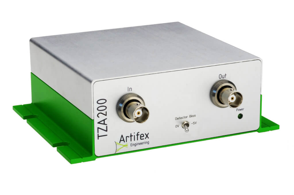 These transimpedance amplifiers are particularly useful for the measurement of current from photodiodes. The output is a voltage linearly proportional to input current and thus, to input power in photodiode monitoring applications. The fast response time at high signal-noise-ratio makes the TZA series particularly useful in systems control feedback loops.